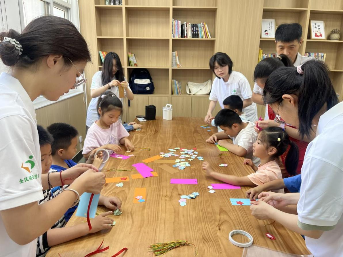 随后,上海路社区工作人员带领小朋友们动手DIY书签,孩子们通过裁剪、拼贴、绘画等方式,将卡纸、线绳等材料裁剪、搭配,不一会儿,各种原材料渐次化作形态各异的书签——或绘着星空宇宙,或缀以蝴蝶流苏,每一张都藏着童真对书籍的奇妙想象。在志愿者们的协助下,孩子们都制成了自己的专属书签?!拔乙厝ニ透杪瑁刻焱砩隙蓟岣医补适?,书签可以帮她记住看到哪一页!”朵朵小朋友开心地和小伙伴分享道。